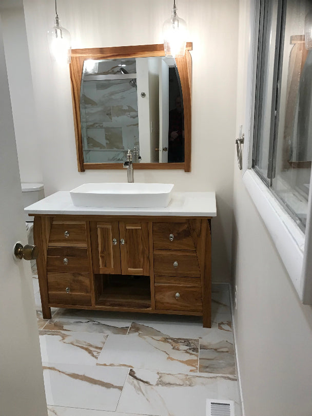 This bathroom has come a Long way! All because of the beautiful teak vanity and mirror!