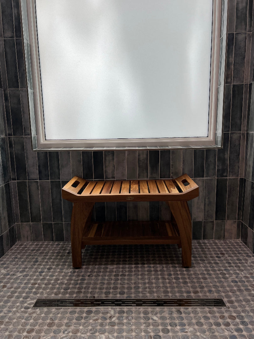 Teak bench addition to our freshly remodeled master bathroom sitting at the entrance to our walk in shower
